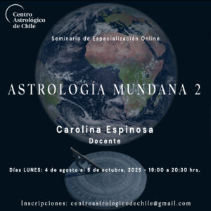 Profesora de la Especialización de Astrología Mundana I y II en el Centro Astrológico de Chile y Conferencista, junto al Equipo CACH, sobre los temas de actualidad en Chile y el mundo, mirados desde la Astrología Mundana.