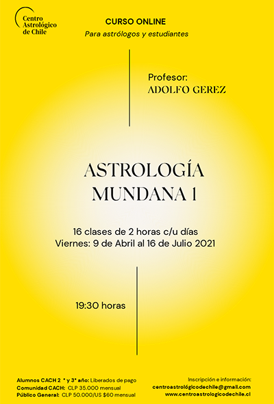 Durante el curso, analizaremos acontecimientos mundiales y su dinámica por medio de técnicas propias de Astrología Mundana, como son los ciclos planetarios, eclipses, tránsitos, etc., aplicados a la política nacional e internacional a fin de entender el mundo actual, el que viene y la posición en la que nos encontramos.